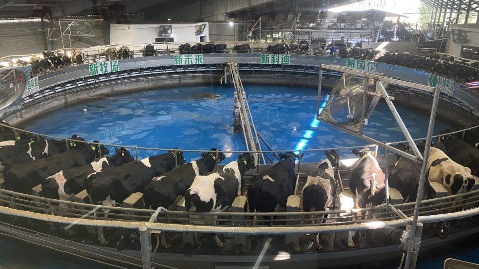 “這個轉(zhuǎn)盤有80個擠奶位,每個位置正好站下一頭牛,牛走上擠奶位后,擠奶設(shè)備會自動與奶牛對接,自動擠奶就正式開始了!”8月29日,在商丘市虞城縣科迪智慧牧場,工作人員介紹著擠奶流程。